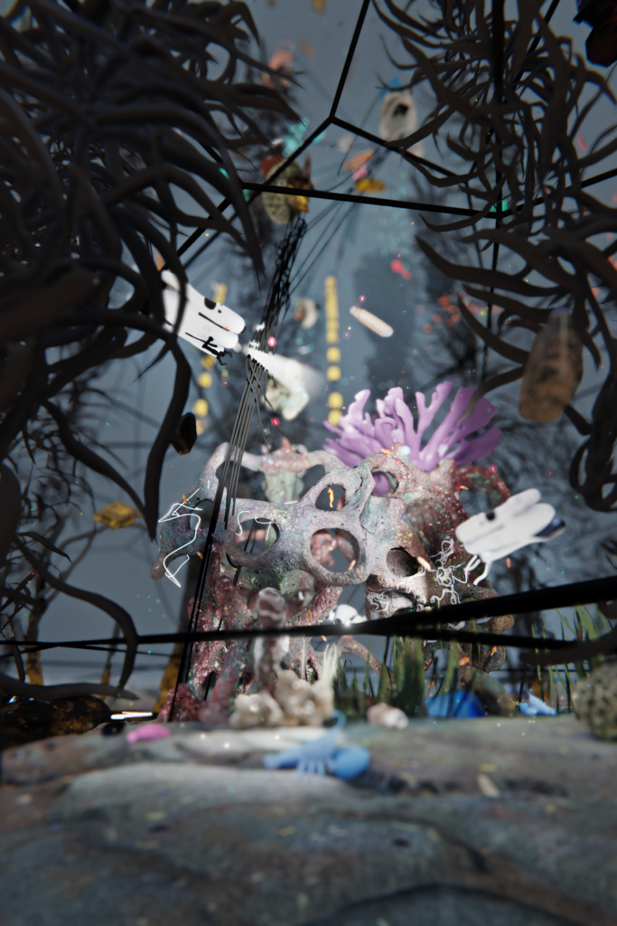 • Drift Lattice, de Theo Triantafyllidis, es una instalación inmersiva que nos transporta a un océano virtual e interactivo, en constante transformación, que nos muestra en tiempo real como reaccionan los océanos a los cambios climáticos y ecológicos globales.  Con una serie de drones digitales que nos muestran monstruos avisales, los que más nos acongojan son los plásticos que portan los caballitos de mar.